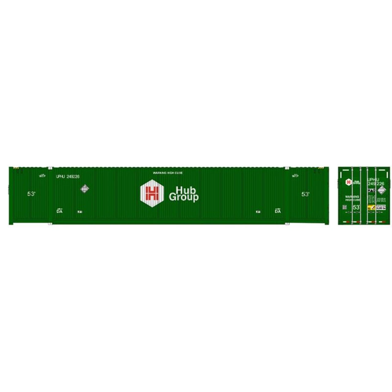 FEATURES: • Side corrugations with an 8-55-8 arrangement • Front wall with 10 vertical corrugations • Roof with 6-54-6 corrugations • 1-3-1 beveled doors • Placard holders on front wall, sides and door • Each set comes as a 3-pack w/different road numbers Atlas N Scale 53′ Containers – HUB (Union Pacific) Set #2 Road Name: Hub Group Road Number: 249467, 249555, 249642 Photo may not show actual road number. Please see description above for the road number.