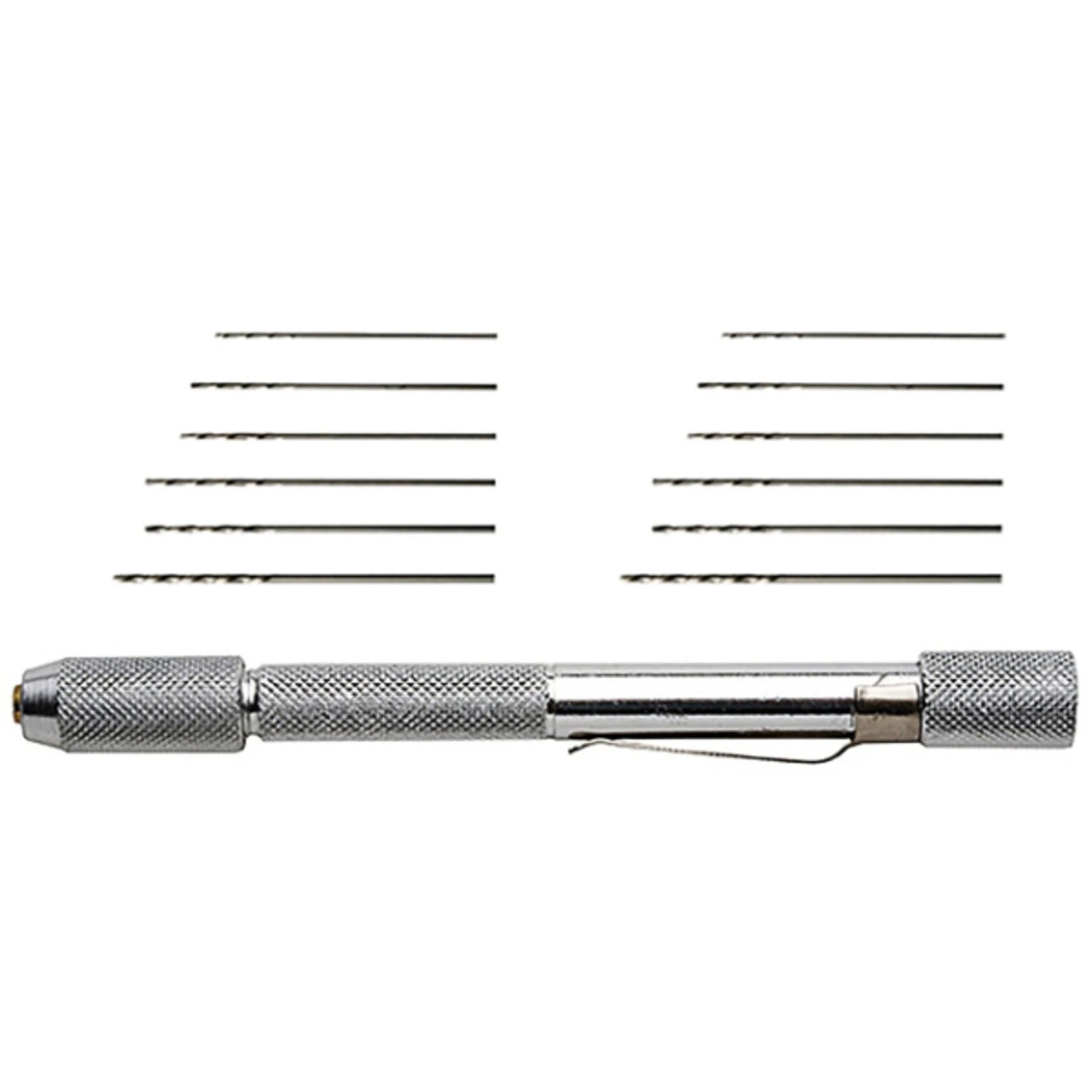 Pin Vise for mini high speed drills. Used for lightweight work on plastic, woods, metals and more. Includes an integrated brass chuck that commodates drills #50 (.0635″”) through #80 (.0135) and features a non-slip knurled surface. Includes 12 high speed drills included in the body of the pin vise.
