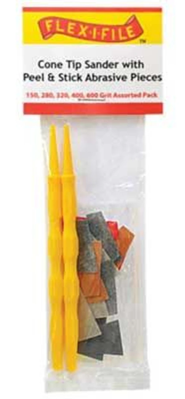 Simply peel and stick the abrasive pieces to the handle produce a tapered cone shape sander. Easy to remove, will not leave adhesive residue