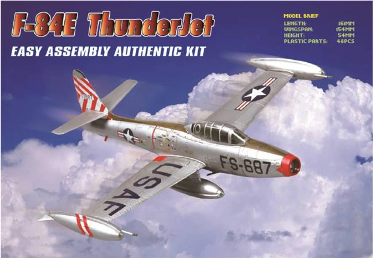 The first effective and fully-capable Thunderjet was the F-84E model which entered service in 1949. But the F-84E was withdrawn from USAF service in 1956, lingering with ANG units until 1959. The Republic Aviation Company F-84 Thunderjet was a turbojet fighter-bomber aircraft. Originating as a USAF proposal for a daytime fighter 1944. The F-84 first flew in 1946 and it entered service in 1947. When production of the F-84 was closed in 1953, about 4457 had been built, including 6 different versions.