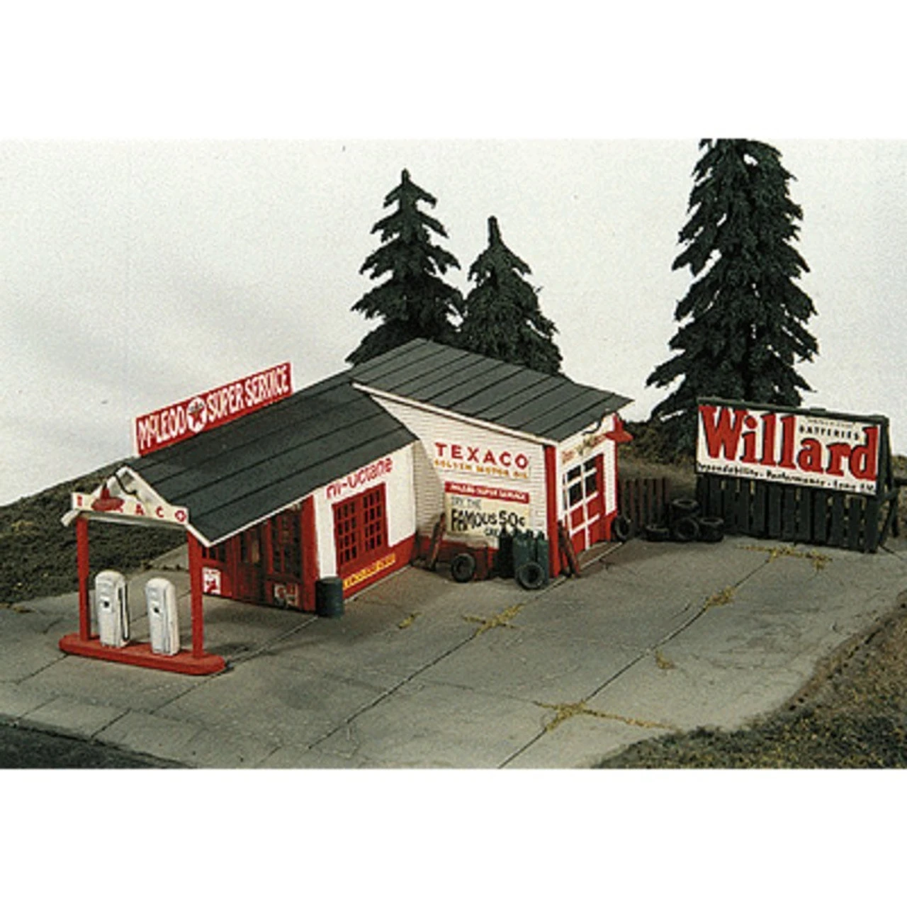Laser cut Northeastern basswood siding, Grandt Line windows & doors, JL’s own metal detail parts, board style fencing & 60 full color gas station signs. 2-1/8″ x 1-7/8″