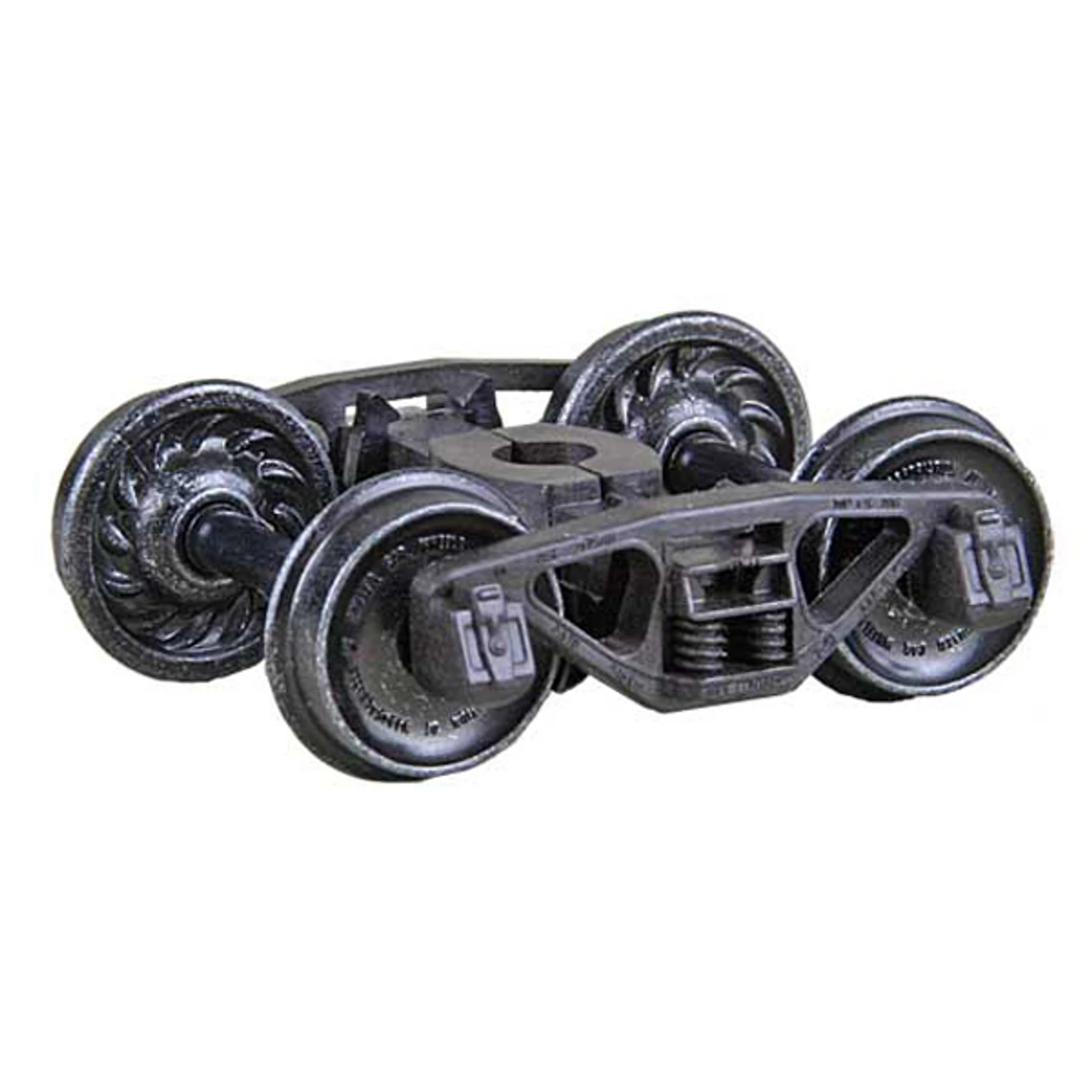 A.S.F.® Ride Control® 50 Ton Self Centering Trucks ribbed back wheels “HGC” Two Piece Fully Equalized Trucks 1pr. Mounts with a #2 or 2-56 screw. The A. S. F.® A-3 Ride Control® 50-ton freight truck was introduced in the 1940’s and is one of the forerunners of modern freight trucks. Features embodied into this design include a longer spring travel, no spring planks and constant friction control using friction castings in the bolster to dampen excessive lateral roll of the car. These design features allowed for a higher train speed with less danger of derailment than previous designs. ASF® sold over 140,000 sets by 1949. This truck is excellent for modeling the transition era up to 1994 when friction bearings were no longer allowed in interchange service. Truck Features • Self Centering Action – Trucks self align themselves parallel with the car for easier placement on track. • Code 110 (.110) 33″ ribbed back wheels • “HGC” Weighs nearly the same as Metal Trucks • Superior Rolling Ability. • Brake Pads • Accurate markings • Incredible detail True to prototype • Non-magnetic Metal Wheels • Highly Flexible Fully Equalized Trucks • Smooth tracking Free rolling Contoured Insulated Axles • RP-25 Free rolling wheels • Patent number 7,434,518 B2