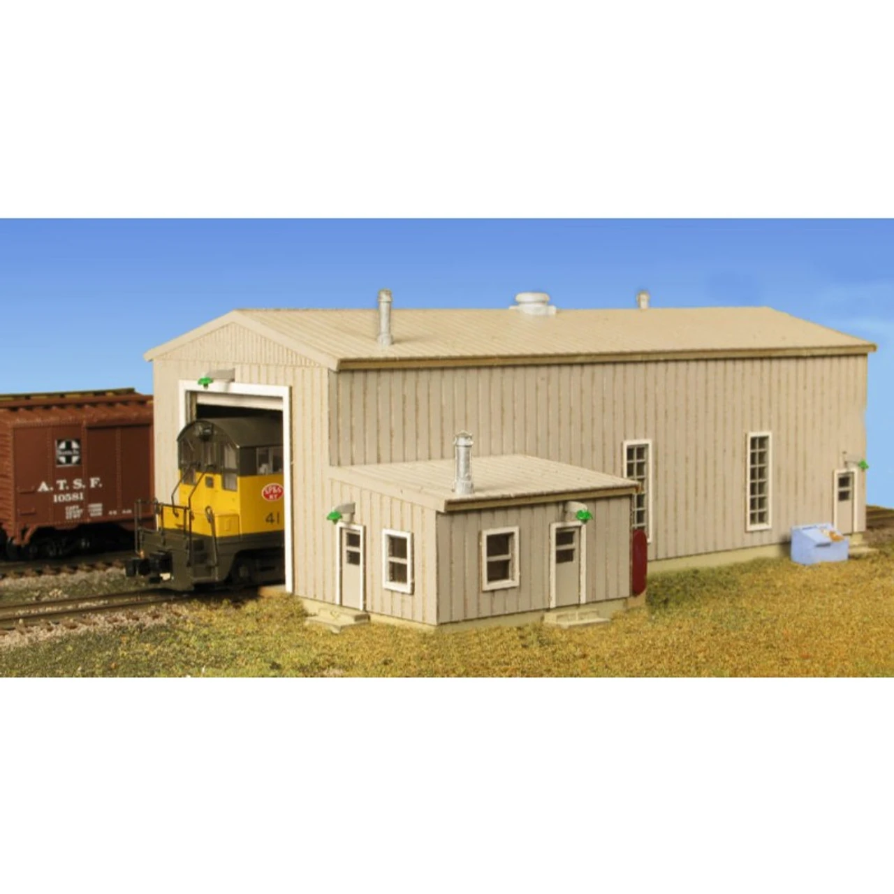 Diesel Engine Houses like this were constructed along railroads at most rail yard facilities. After steam engine roundhouses were retired, diesel engines needed a more modern facility in which to maintain them. These buildings often included door cabinets, supply cupboards, lube oil, sand storage bins, automatic oil burning space heaters, a desk and clothes lockers. This engine house has space for one locomotive and includes the smoke jack vents to exhaust the diesels.