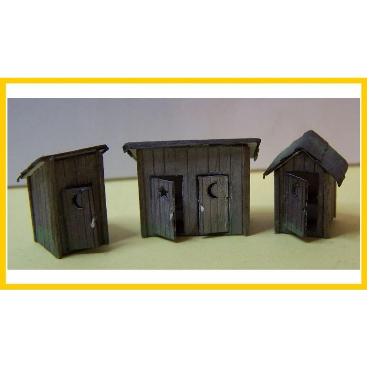 Out house’s were an icon until the late 50 in most of rural America and still many are in use today. The kit includes 3 unique out houses with seats. Two single stall and one two stall. Use them behind the house or barn, or in your yard so your train crew has a place to go read.