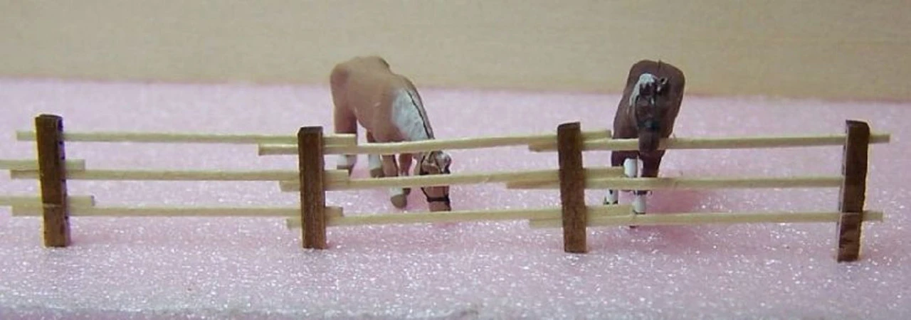 Kit comes with 32 posts and enough strip wood rail for a fence of between 19 and 25 inches long, depending on post spacing. That is between 250 and 330 scale feet.