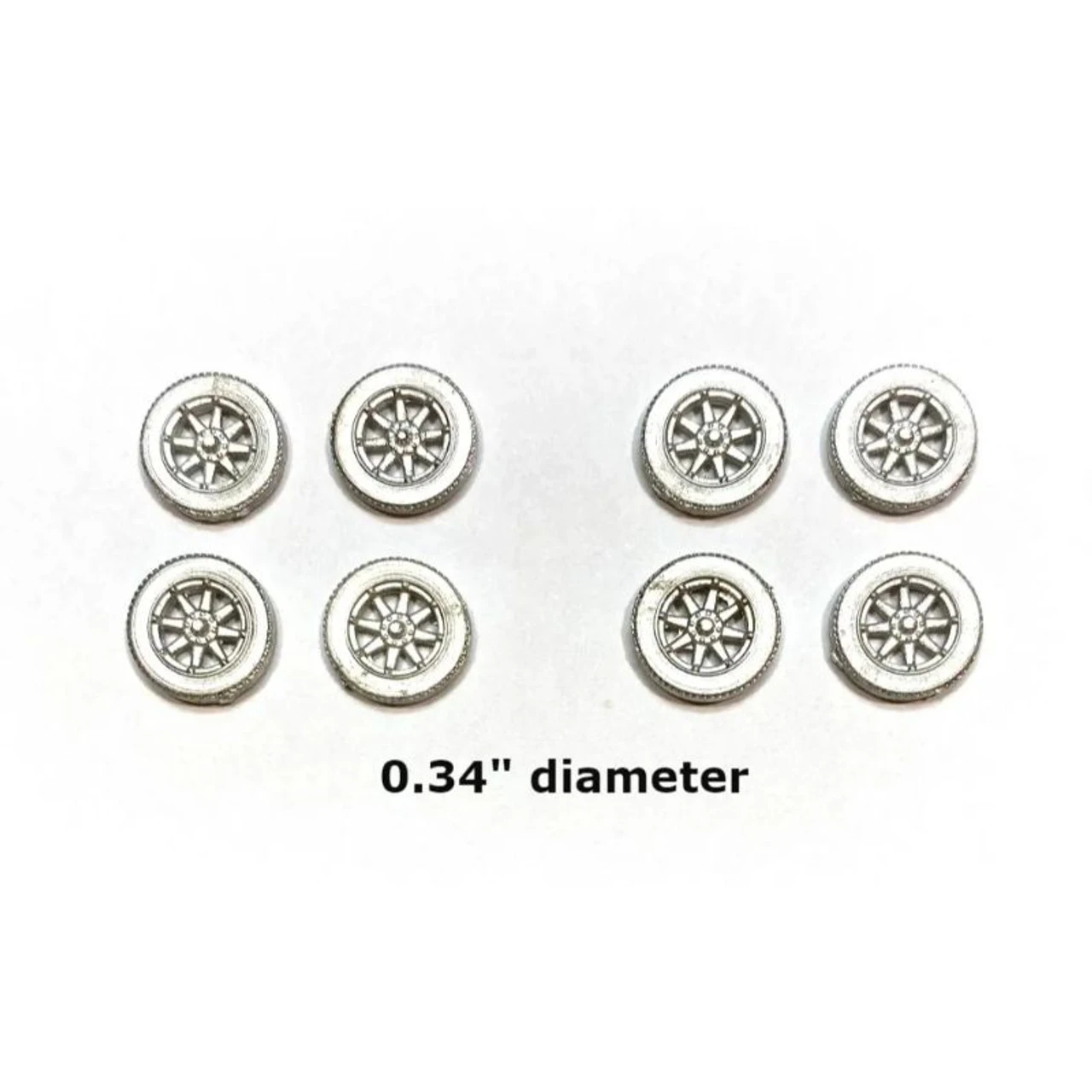 These wheels are from our 1929 6 speed delivery van kit. They are 0.34″ in diameter. There are 8 wheels in this kit. Showcase Miniatures HO Scale Spoked Wheels