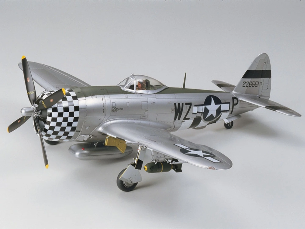 ★Republic P-47D Thunderbolt “Bubbletop” plastic assembly kit. ★1/48 scale. Fuselage length: 230mm, wingspan: 259mm. ★This is the representation of P-47D late production that was nicknamed “Bubbletop”. ★The massive form of the plane, especially its belly and its cowling, has been accurately reproduced. ★Flaps come as separate parts and can be attached in the up or down position. ★Parts for replication of 3 types of mirrors, gun sights and 4 types of propellers are provided. ★Engine cowling flaps and the intercooler air outlets on each side of the fuselage can be represented in the opened or closed position. ★Parts for replication of 500-pound bombs, rocket launchers and three types of drop tank are part of the kit. A pilot figure and decals for two different markings are included.