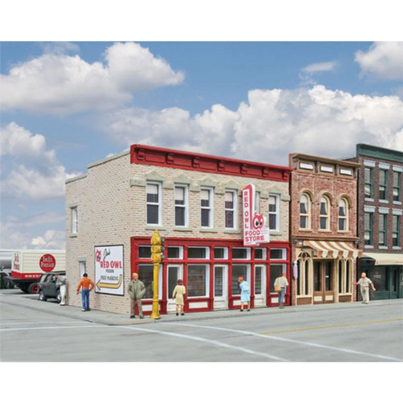 Jim’s Red Owl is the neighborhood market where everyone in town shops or congregates to meet up with friends. This Walthers Cornerstone HO Scale kit is a great addition on Main St. in any size town or neighborhood business district. This easy-to-build plastic Red Owl storefront kit is an officially licensed model and includes decals for lettering your own delivery truck or trailer. It’s proportioned to work perfectly with Cornerstone Merchant’s Row structures, so it’ll look right at home when blended in with other storefront buildings on your layout. Jim’s Red Owl looks great with the Merchant’s Row storefronts or along Main Street among other Cornerstone HO Scale businesses. Officially licensed model Windows and doors molded in place for fast assembly Window acetate Authentic front sign Printed interior detail sheet Custom decals for delivery truck and trailer up to 53′ (vehicles sold separately) Perfectly proportioned to work with Merchants Row I (933-3028) and II (933-3029) kits, each sold separately. Jim’s Red Owl measures: 4-1/4 x 3-5/8 x 3-3/8″ 10.8 x 9.2 x 8.6cm RED OWL and the RED OWL fanciful head design are trademarks owned by SUPERVALU INC. or its subsidiaries and are used with permission.