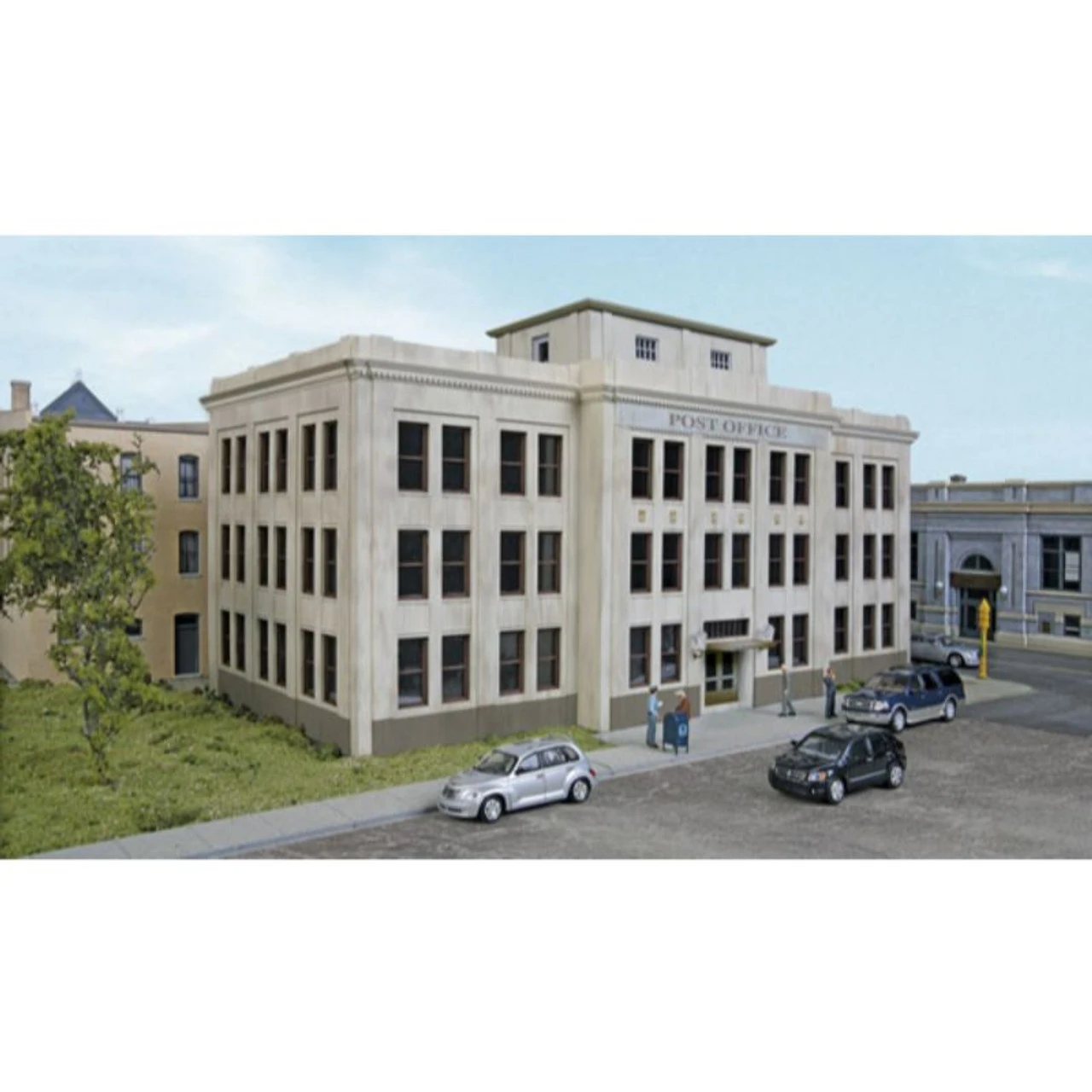 Whether used near Union Station or deep in the heart of downtown the Walthers Cornerstone United States Post Office is an ideal addition big city scenes set in eras from the first half of the 1900s into the present. Home to the Postmaster and housing dozens of employees working behind the scenes, this structure is where the business of handling mail also supports the processes to keep things running smoothly. Typically facing a busy street, these monumental buildings projected an image of quiet power. The United States Post Office building also makes a great headquarters office for all kinds of businesses and looks right at home in a city setting or at the edge of a large industrial complex. As shown it measures: 13-1/2 x 7-1/16 x 7-1/4″ 33.7 x 17.9 x 18.1cm Great office space for a post office or other large corporation Fits steam or diesel-era layouts from the 1920s and beyond Realistic decals for a high school, hospital, county courthouse and library Detailed rooftop machinery house Easy-to-build plastic kit Molded in three colors and clear window glazing