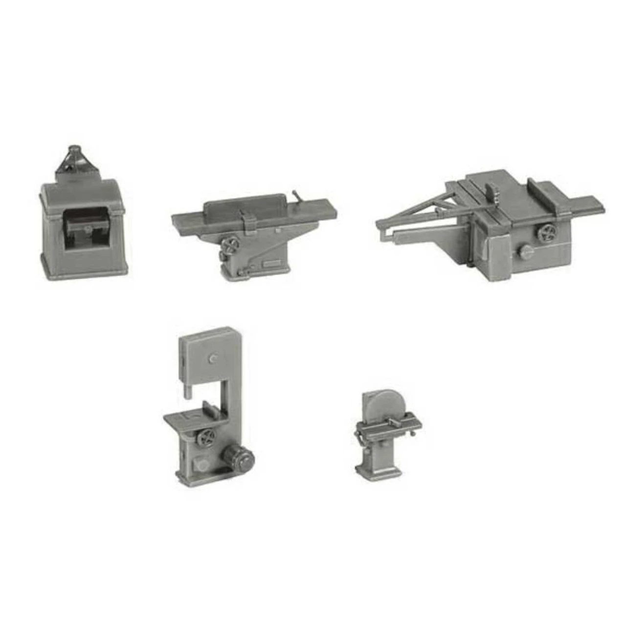 Perfect for detailing an HO garage workshop, lumber yard or small industry, this SceneMaster Woodshop Equipment kit is complete with a jointer, large table saw, planer, disc sander and band saw, all molded in gray plastic. Makes a great load in the back of a truck too! Walthers HO Scale Woodshop Equipment