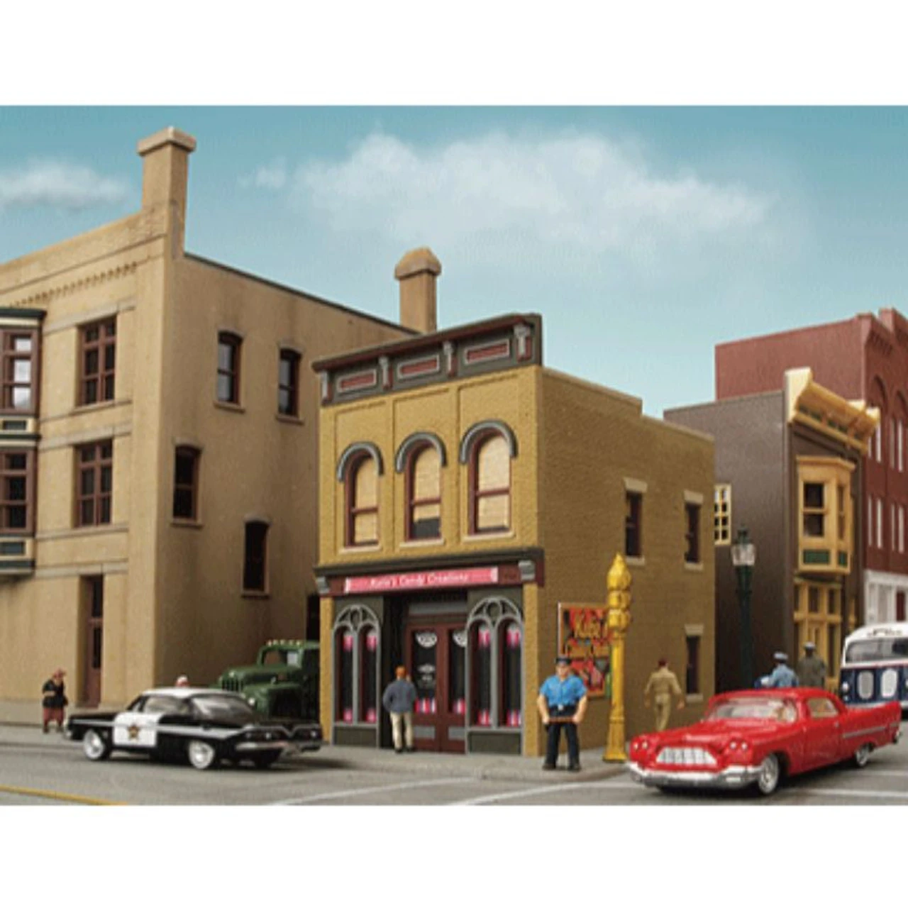 Katie’s Candy Creations is a WalthersTrainline business building that is a natural addition to any small or medium town storefront commercial district. Featuring a brick exterior, this fully assembled two-story structure is typical of Main Street businesses seen across the continent. This building features parts molded in appropriate colors so there’s no painting needed. Colorful signs come applied to the built-up structure and factory-installed windows with realistic printed banners make this building ready to use in any scene along your railroad. Figures, vehicles and accessories shown in the photo are sold separatley. Walthers HO Scale Katie’s Candy Creations Road Name: Road Number: Photo may not show actual road number . Please see description for actual road number